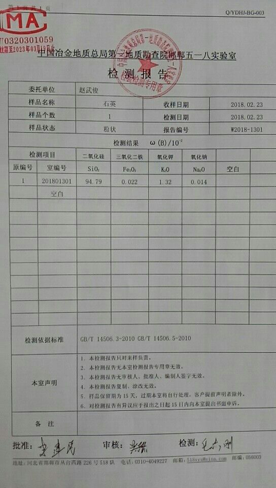 矿石化学成分:二氧化硅97.30一97.32%,氧化铝0.97~1.04%,氧化铁0.62~0.67%,氧化钙0.034—0.043%,五氧化二磷0.003%。吸水率1.01~2.55%,耐火度可达1716—1723℃。